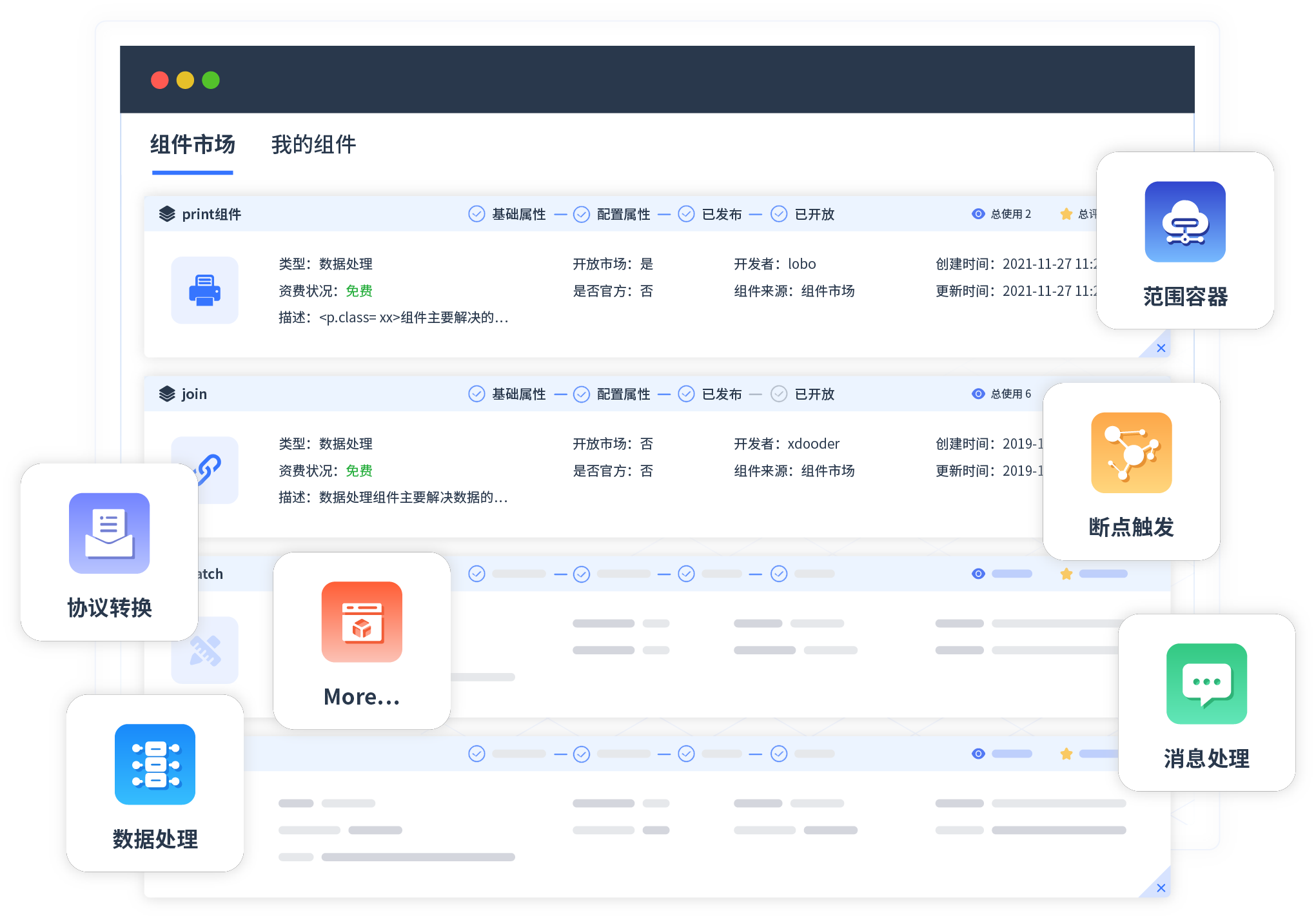 针对集成场景,凯发k8网站提供组件市场,例如协议转换、消息处理、文件操作等。除平台提供的组件外,客户可以自定义所需组件。
